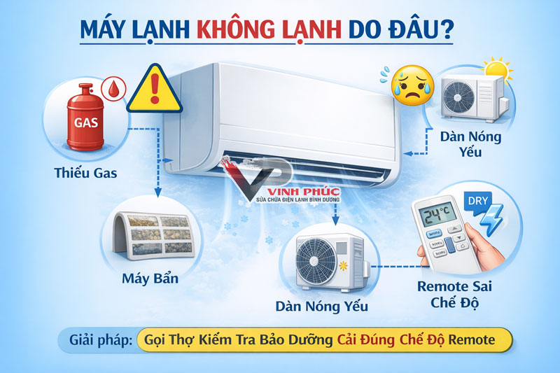 Máy lạnh không lạnh dù đã mở hết công suất là tình trạng khá phổ biến trong mùa nắng nóng. Khi máy lạnh không đạt được độ lạnh mong muốn, không chỉ làm giảm sự thoải mái mà còn khiến thiết bị tiêu tốn nhiều điện năng hơn. Điện Lạnh Vinh Phúc sẽ giúp bạn hiểu rõ nguyên nhân máy lạnh không lạnh và hướng dẫn cách khắc phục hiệu quả nhất.